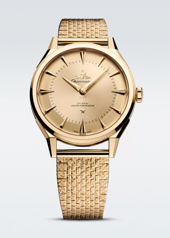 The collection—featuring nine references in both precious metals and O-MEGASTEEL—includes a 39.4 mm case and designs that pay homage to earlier models. Inspired by the 1948 Centenary, the collection presents the pie-pan dial introduced in 1952, paired with the perfect copy Omega Constellation watches star and an observatory medallion on the caseback. The textured guilloché finish on the facets dates back to 1953, and a brick pattern on an 18K Moonshine™ Gold mesh bracelet references the elegance of the period.