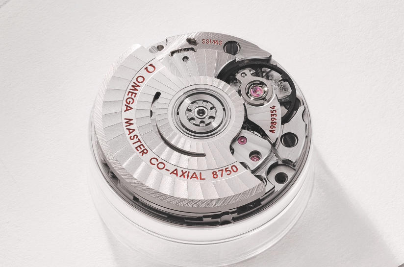 The cal. 8750/8751 uses the latest version of Omega’s Co-Axial escapement, but a key factor in its accuracy is the free-sprung balance with four white gold regulating screws on a silicon balance spring.